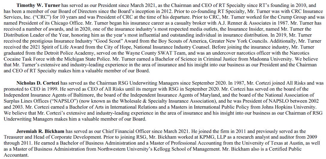 Patrick Ryan is 85 years old and so forces prospective shareholders to consider who may run Ryan Specialty next. Three current executives officers are worth familiarizing ourselves with as current and future leaders of RYAN; Timothy Turner, Nicholas Cortezi and Jeremiah Bickham, biographies from The Company’s 07/2021 prospectus: